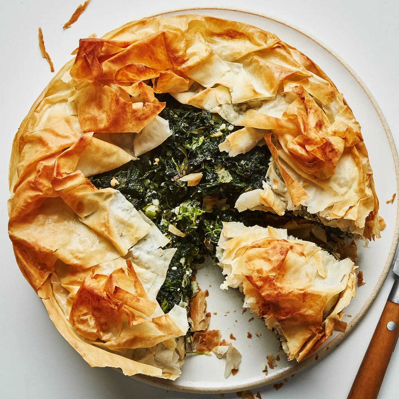 Spanikopita is a savory Greek pie filled with Spinach, usually layered in a casserole or formed into tiny triangles. This recipe takes a few liberties with tradition; the filling is a mix of local greens and this rendition is molded it into an open-face tart that requires much less technique.